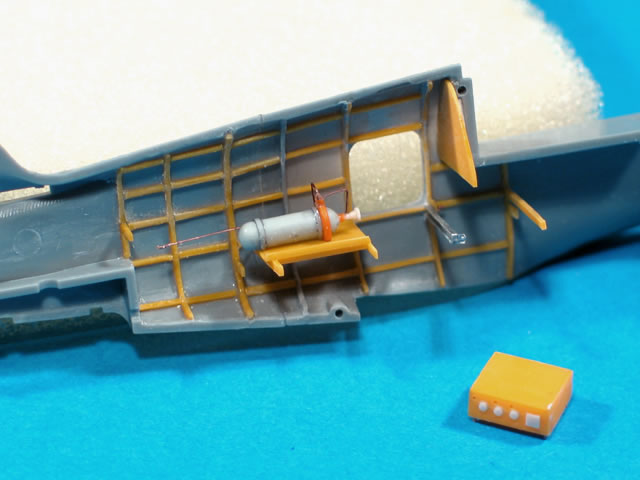 I have added some other scratchbuilt extras like the ammunition compartment of the wing, the radio equipment and oxygen cylinder. The cockpit has been improved with strips of copper and plastic plate. The rest of the plane is from the box.