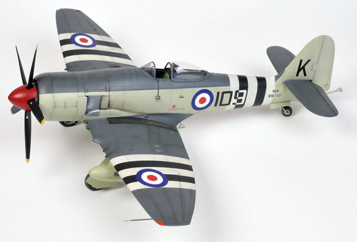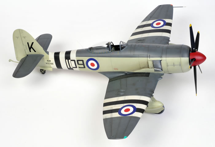 Markings came from a combination of the magnificent Cartograph decals supplied in the kit, along with the uniquely Australian markings from Aussie Decals.   The Aussie Decals ‘K’ on the fin was significantly under-size for this particular aircraft so was replaced using strips of black decal, while the identification stripes were painted.   The spinner was painted red and the back-plate painted EDSG in accordance with the aircraft as it is currently displayed in the Australian War Memorial, though some references show VX730 with a grey spinner.   There are no known original colour photos, though period black and white photos clearly show the spinners of at least some Sea Furies during this deployment to be something other than EDSG or Sky.