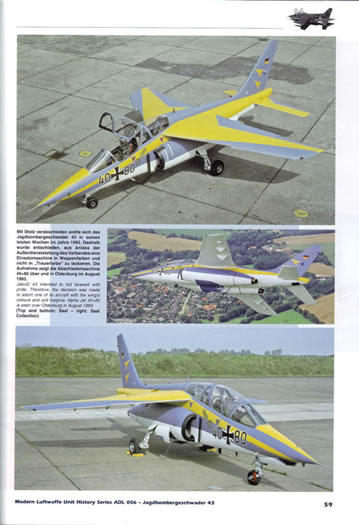 The latest volume covers Jagdbomber Geschwader 43, which formed in 1964 with Canadair Sabre Mark 6 aircraft handed down from Luftwaffe fighter wings and successively equipped with the Fiat G.91 Gina, and finally Alpha Jet when disbanded in 1994.