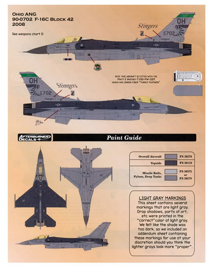 All of the aircraft on the sheet wear the standard F-16 Tactical Paint Scheme (TPS) of overall Federal Standard (FS)36270, with FS36118 upper surfaces and FS36375 sides and missile rails with minor variations that are noted on each of the placement guide sheets as appropriate.