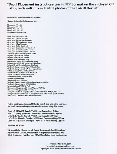 As the title suggests, the sheet provides markings for the F/A-18 Hornets operated by VMFA-122.  Markings are provided for 15 machines in all with 13 of them being those that were deployed to Iraq in 2008.