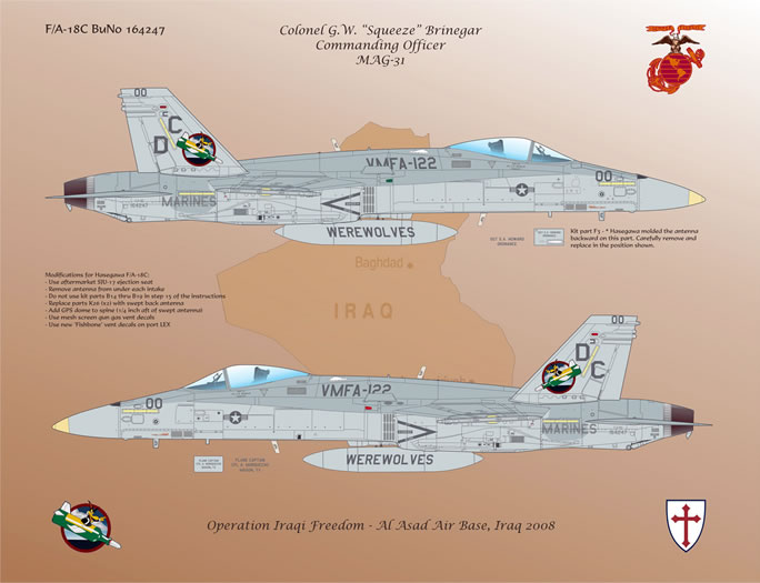 • F/A-18C, Bureau number 164247, modex 00, as it appeared at Al Asad Air Base (AB), in northern Iraq circa 2008.  This was the Commanding Officer of Marine Air Group 31 of which VMFA-122 is a part and as such it exhibits a little colour in the form of cartoon artwork on the outer surfaces of the vertical stabilisers.