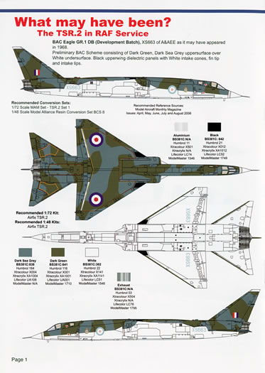 The decals on this sheet are more or less an extrapolation of the camouflage schemes and markings that the TSR-2 would have worn in RAF squadron service had it have got past the politicians and actually made it into service. Puzzlingly, the name “Eagle” has been applied to the aircraft and try as I did, I could find no reference to that name in conjunction with the TSR-2 so it’s my guess that it is a result of a further trip into the “what if” world.