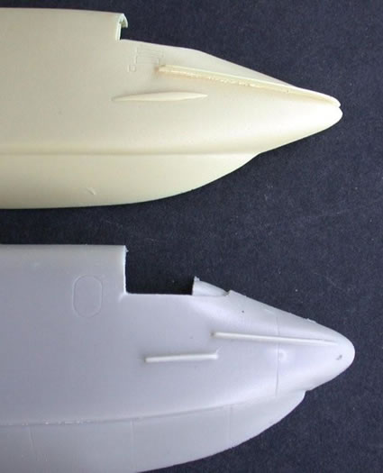 The deeper, “fatter”, nose section of the Mach 2 fuselage is immediately evident, and turns out to be much more correct when compared with photos of both the pre- and production airframes. The Anigrand forward fuselage is less deep by roughly 1/4", and the radome assembly is much longer and more pointed than in the real deal. I have a suspicion that, just as in the case of the incorrectly shaped Anigrand C-124 engine cowlings (that I reviewed a year or so ago), the lines of the master model may have been taken from original Airmodel vac kit 1/72 drawings. The strange