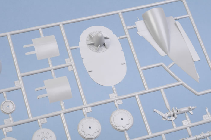 The wings are remarkably simple - upper and lower halves on each side trapping a single-piece main wheel well, plus flaperons. The modeller is offered the option of main landing gear legs in plastic or in cast metal. All tyres are vinyl - not my favourite medium, I must admit, but once again I'll bet the after-market will ride to our rescue pronto.