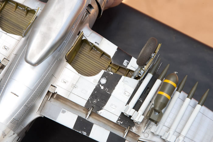 Bare metal foil on the other hand, is a delightful product, so easy to use in fact that I regret not using more of it. I put it on the undercarriage, the belly of the fuselage, some of the removable panels and various other small panels to achieve a slightly different hue throughout the aircraft. At first I was going to set it up as a long range escort, but I thought it would look more interesting as an attack plane and Trumpeter provide a generous selection of under wing stores.