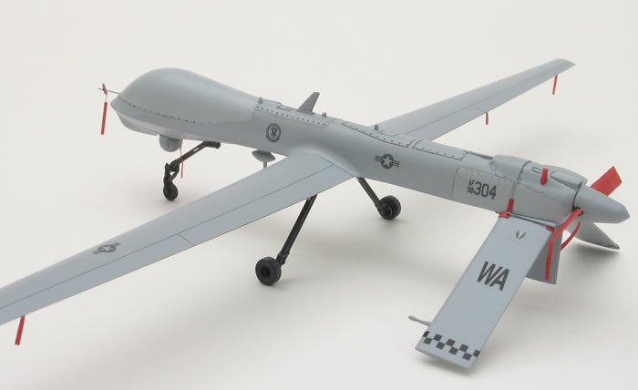 My Italeri / Platz RQ-1 Predator kit has been built nearly “straight from the box”, only adding the RBFs stripes plus some protective covers. I decided not to add the weapons, for no wing pylons were included in the ITALERI kit, nor were the missiles and missile rails. Each wing has a gap for adjusting the underwing pylon (for MQ-1 version), so you could scratch build them and build an MQ, or simply fill the gaps with a thin plastic rod and putty them as I did.