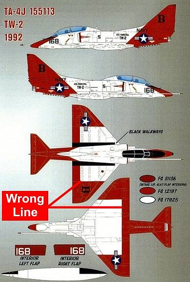 This was an attempt by the US Navy in the early 1990s to improve the visibility of training aircraft. They tested a form of this scheme on most of the training command aircraft. I assume the tests for the Skyhawk were inconclusive because they did not start re-painting the entire TA-4J fleet into this scheme. Decals are available (from Afterburner Decals on sheet 48-039) for this aircraft from TW-2.