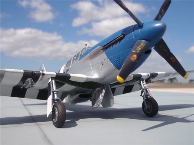 The invasion stripes were masked and airbrushed with Testor's Model Master enamels. The Aluminium finish is Model Master Buffing Aluminium Plate, dry brushed and buffed.