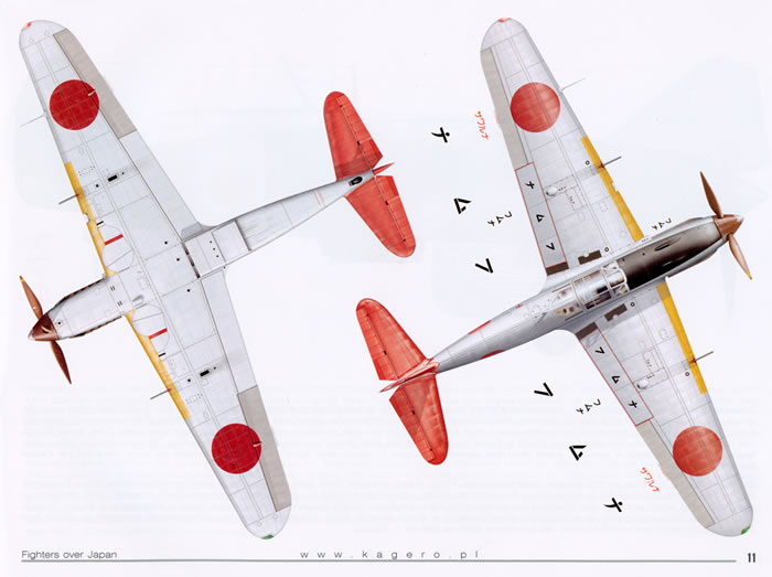 • Nakajima Ki-84 Ko Hayate coded 69 of the 47th Sentai and flown by Teichi Hatano from January 1944.  Upper and lower surface plan views are also provided for this machine.