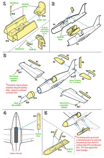 The injection-molded airframe has engraved panel lines, and the kit features a vacuform canopy plus extensive resin parts (full cockpit, Argus pulsejets, landing skid, takeoff trolley, wing generators and control surfaces).