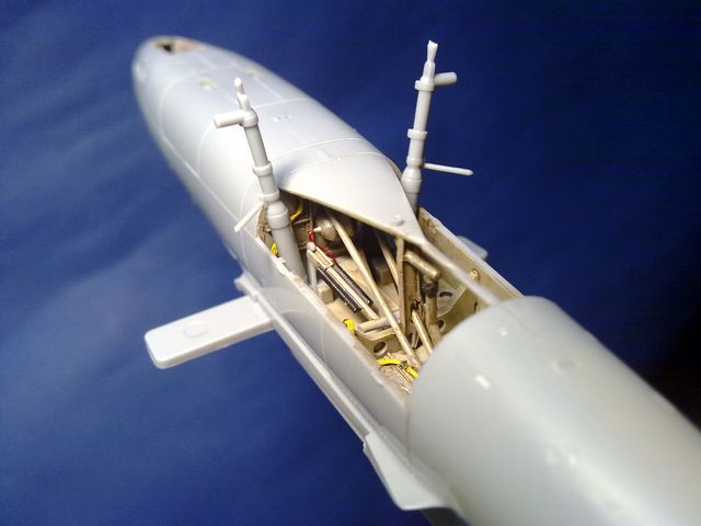The model is painted with Gunze colors, I used Gunze RLM Light Blue color on the bottom and on The top Rlm83 Dark Green, Cockpit Interior in Rlm66 and wheels Bays in RLM 02.