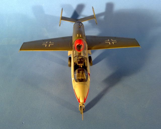 Here is my 1/48 scale Tamiya Heinkel He162 A-2 finished in the markings of the 1/JG1, as flown by Leutnant Rudolf Schmitt, May 1945 Leck, Germany.