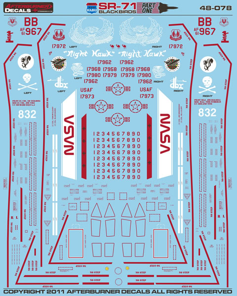 48-078 - "Blackbirds Part #1" is a radical departure, being the first foray into SR-71s. For a long time, there has been clamoring for good markings for the SR-71s that haunt everybody's stash. Now, the excuse is removed from building them! The sheet covers 11 jets, from the mid 90s through retirement, including a NASA jet, and several combat jets with mission markings and tail art. Full stencils and extensive modeling notes.