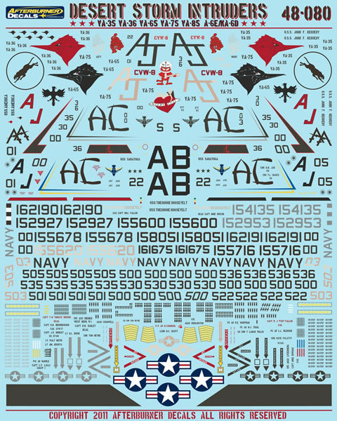 48-080 - "Desert Storm Intruders" covers A-6Es and a KA-6D from Operation Desert Storm, and features 2 aircraft from VA-65 USS Theodore Roosevelt, the CAG jet with "Garfield" art, and their experimental 2-tone brown camouflaged jet, 3 jets from VA-36 USS Theodore Roosevelt, the CAG jet in 2 eras, one with nose art, the COs jet and a line jet. Also included are the CAG jet and a line jet from VA-35 USS Saratoga, VA-85s CAG from USS America and 3 jets from VA-75 USS John F. Kennedy, the CAG and COs jets plus a KA-6D. All have plenty of mission marks, art and will allow those guys who love grungy combat iron haulers to do their worst weathering these birds!
