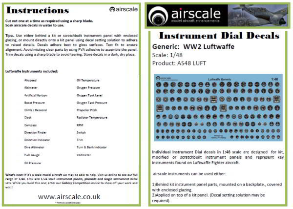 The concept is very simple. Airscale provides individual decals in sets that apply to a particular scale, era and nationality. These may be used to enhance a kit cockpit or instrument panel. The individual decals may also be used to help scratch build a new instrument panel if you are not happy with the kit offering. The dial decals may also be used as individual overlays for a kit's plastic instrument panel. This is especially relevant if the kit has flat disks for the dials (such as most Tamiya 1/48 scale kits).