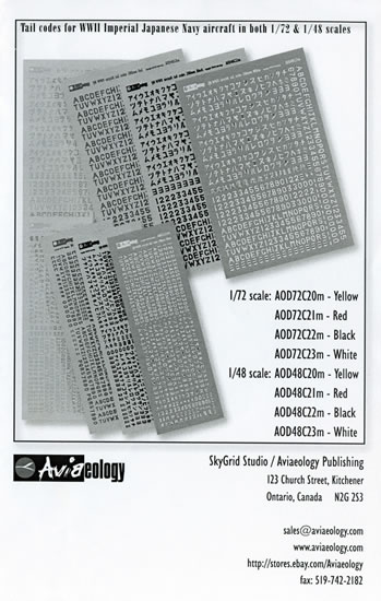 For the uninitiated, Aviaeology Decals are produced by SkyGrid Studios in Ontario, Canada. In the main, they concentrate on providing decals for machines operated by Canadian squadrons and pilots during WWII. They also produce sheets of serials numbers and code letters. It is in this second category that that have released eight new sheets that carry tail codes for aircraft operated by the Imperial Japanese Navy during WWII.