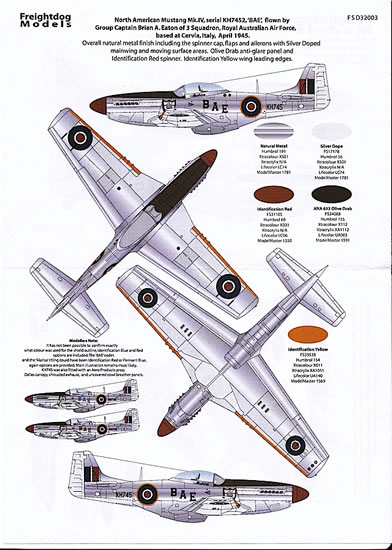 Mustang Mk.IV, KH745/BAE, “Marisa” of Group Captain Brian A. Eaton of 3 Squadron, Royal Australian Air Force, Cervia, Italy, April 1945. This aircraft was finished in a combination of bare metal and aluminium lacquer, and featured Eaton’s initials “BAE” in a staggered pattern on both sides of the fuselage under the cockpit. According to David Muir’s “Southern Cross Mustangs”, these initials and the name “Marisa” should be dark blue, drop shaded in black. This option is provided by Freightdog, but – acknowledging that period black-and-white photos of KH745 aren’t definitive in terms of colour (the only one I could find was of very poor quality) – Freightdog also provides an additional decal sheet offering the codes and name in red and light blue for modelers who believe these might be better choices. The same options are provided for the Desert Air Force emblem which was carried on both sides of the fuselage forward of the cockpit, and which features a cross on a shield overlaid by a bird carrying a bomb. However, in my view the detail on this emblem is a little simplistic for this scale, and on the sheet, at least, you can see the underlying yellow of the cross showing through the blue of the bird. The instruction sheet offers four-view colour drawings, and helpfully identifies the correct type of canopy, propeller, and exhausts that were fitted to KH745