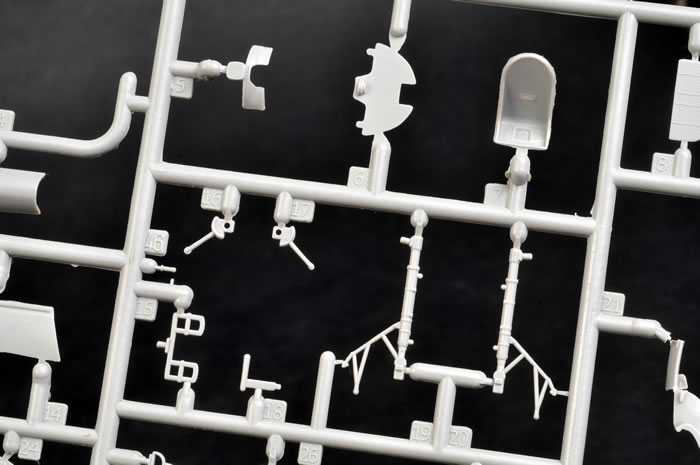 93 ligth grey plastic parts; 12 clear parts; 8 photo-etched parts; decal sheet covering six markings options; 36 page A5 size reference booklet. |
