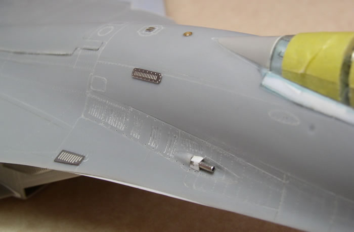 I filled the original panel lines of Airfix kit and recribed all of them togther with full rivetting, using "Flanker DVD" photos as my best reliable references.