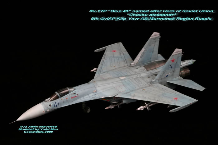 The paint I used are all Gunze Creos Mr. Color lacquer paint. The scheme I chose is the "Blue 41" Su-27P from the Russian Air Force elite squadron, 941st GvIAP which based at Kilp-Yavr airbase, Murmansk Region.