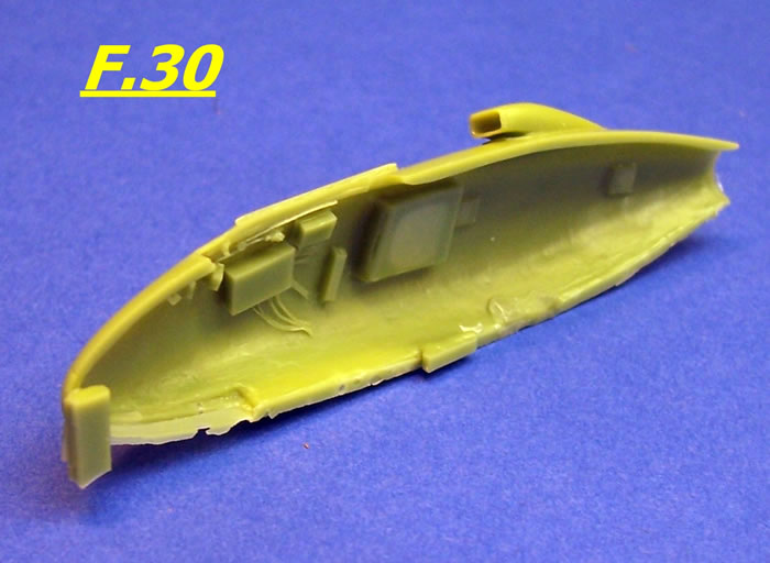F.30: 53 green resin airframe parts, 5 black resin undercarriage parts, 1 pre-coloured PE Fret of 33 parts, 2 vac-form canopies, 1 pre-cut canopy mask, 1 nose marking mask and decal sheet covering 5 options.