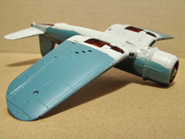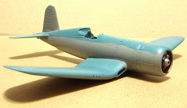 Tamiya spray paints were used throughout. Insignia white for the underside, Intermediate Blue for the sides and fin and Navy Blue for the rest. The not-so-pink-anymore Silly Putty slugs masked off the previously painted areas and once all was cured, the paint was given my usual polishing with 3200 and 4000 grit sanding pads. Now all I have to do is wait for the Lucybelle decals in the Boyington boxing of this kit to arrive.