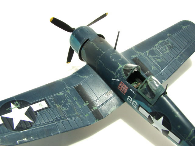 You would think that all the lessons learned during the build of the first Corsair would be applied to the second Corsair. You are assuming any learning was going on. Sorry Tenax breath, not so. Because I was rushing and because I was sleepy, I made several building errors while bashing together the second kit, the worst of which was fitting the wings to the fuselage. I used a rubber band to close a gap at the wing root and thus when the rubber band was released; the wingtips were well above the top of the fuselage. I had to break the wingroot join, apply more Tamiya extra thin and place my tool box on top of the model to flatten out the wing dihedral. It worked and the model looked better.
