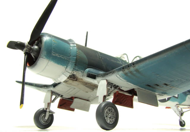 Once clear coated the models were given oil paint washes thinned with non-toxic Duro brand durotine. I used a white wash for Boyington’s tri-color F4U-1A and a dark gray wash for the Birdcage version. Paint chips in Zinc Chromate green were added to the leading edges and gun bay access doors. A Berol silver pencil was used to add a few silver chops of pain to the leading edges of the wings and tail as well as along the walkways and edge of the cockpit. Oil and gasoline spills were added to the forward fuselage. Exhaust stains were added to the underside along with additional oil streaks and stains.