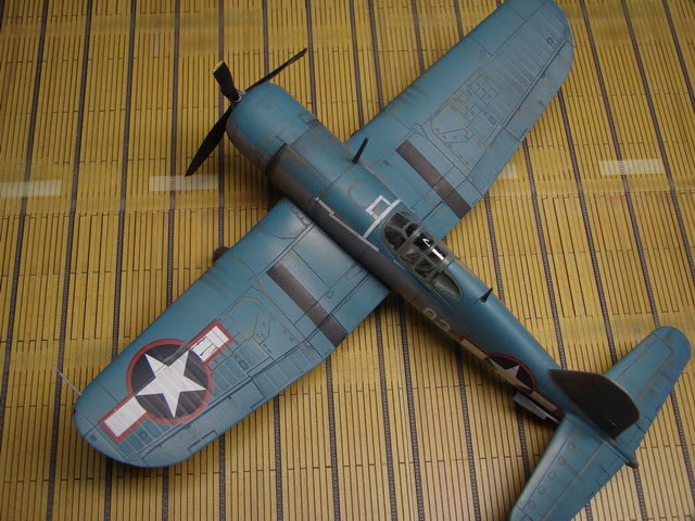 The decals from this kit were applied to the -1A and the Birdcage decals for Boyington’s A/C added to a properly built Birdcage Corsair. The Birdcage was also painted with nothing but Tamiya Spray paints, Intermediate Blue for the overall upper color and Neutral Gray for the lower colors. I think I need to get new pet slugs; these guys are getting a little woozy from all the painting. The gray Silly Putty slugs were used to mask off the two colors while spraying them at 11:00 at night. The paint was polished as usual and decals added.