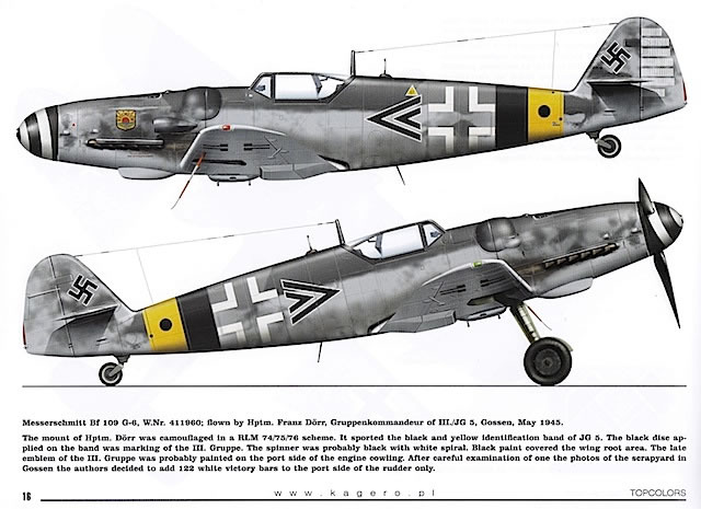 - Messerschmitt Bf 109 G-6, W.Nr.411960/‘Black Double Chevron’, flown by Hauptman Franz Dorr, Gruppenkommandeur of III./JG 5, Gossen, Norway, May 1945. This aircraft was painted in a more standard 74/75/76 finish, with a relatively clean, high colour demarcation along the fuselage sides and a more dense mottling on the upper engine cowling.