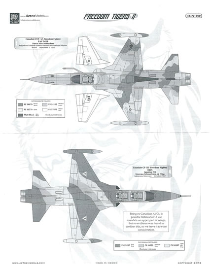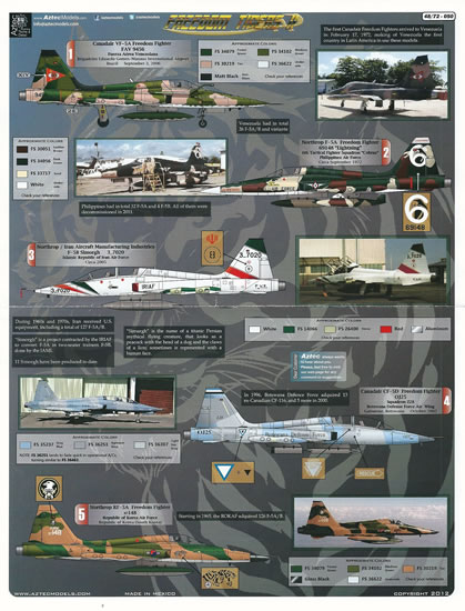 The decals reviewed here cover a variety of Northrop F-5 and Canadair CF-5 single and twin-seat Freedom Fighter options. They are an ideal compliment for the many 1/72nd Freedom Fighter/Tiger II kits available.