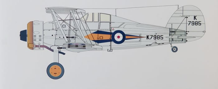 This option is not supported by photographs, but it is believed that the Gladiator did carry the famous 56 Sqn. red and white checkerboard on the fuselage sides for a time, at least.