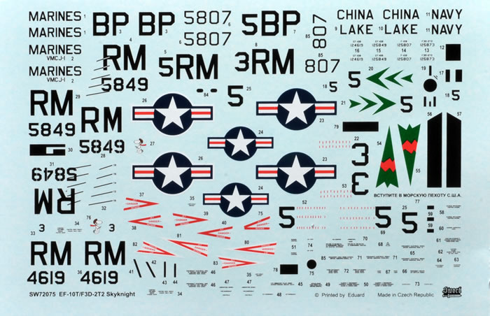 The instructions provide a parts map and easy to follow diagrammatic assembly format. The diagrams are well drawn, and in fact far better than some mainstream brands. There is also a brief history of the aircraft. Generic paint colours are given in Czech and English, with all other text in English. The painting and decal guides use just adequate black & white shaded drawings in the instructions (four-view for the EF-10B, but only two-view for the F3D-2). They mention detail and underside colours but fail to list the upper surface or main airframe colours, leaving this to be deduced by looking at the colour profiles on the rear of the box. I feel that Sword could have done a lot better here, and describe the correct colours using USN names, FS-595 equivalents, and/or model paint range cross-references.