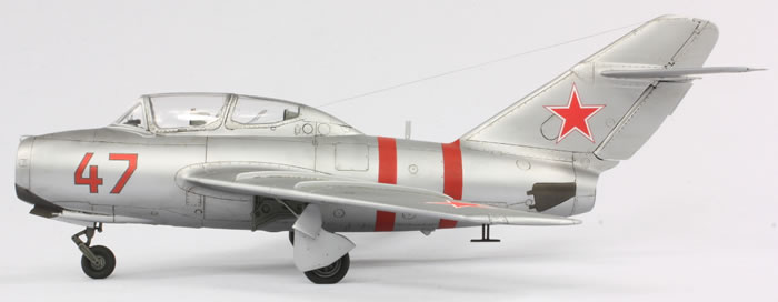Because of when the MiG-15 was in Soviet service, photos were mostly in black-and-white, and I couldn't determine the colour of the bort numbers. In the end, I went with a profile from Yefim Gordon's 'Famous Russian Aircraft MiG-15', red 47 with red fuselage stripes and crooked stars on the tail. I don't like using profiles since I prefer a photo to work from, but this is what I went with.