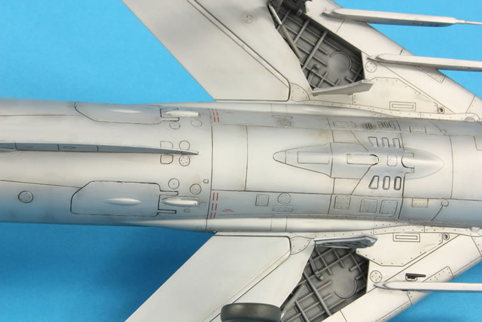 The rest of the fuselage panels were then added. This took a long time as the fit was universally poor, especially panel A16. It took a lot of super glue, sanding, polishing, in some places strips of styrene, and careful rescribing to get an acceptable finish. The bottom airbrake is not a great fit, and those on the side are too small for their openings. Clearly they're all designed to be added open, but I like everything buttoned up.