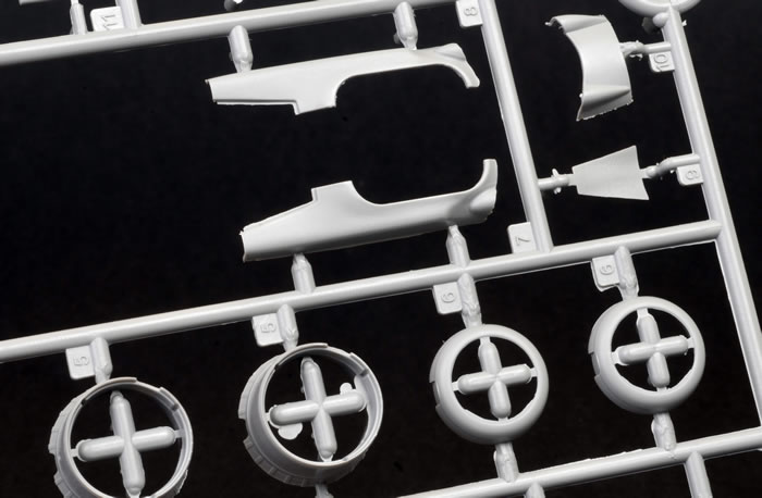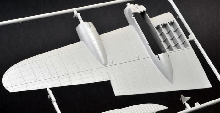 Parts breakdown is logical with conventional fuselage halves, upper and lower wing halves, locating pins and tabs. Sprue attachment points are quite fine too.