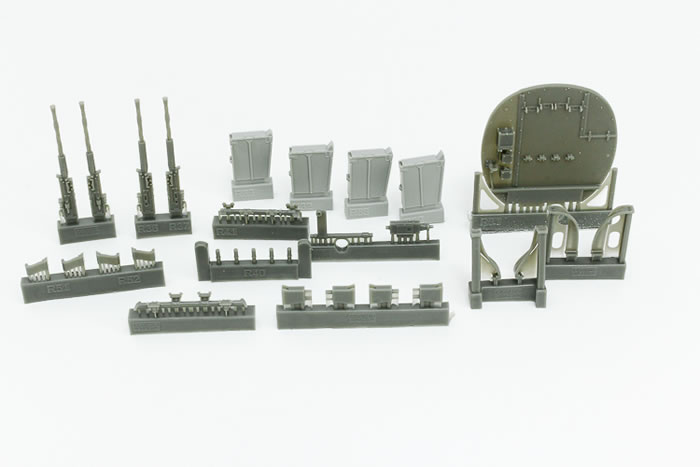Four .303 guns are supplied including all of the ancillary equipment that goes with each one including the ammo feed chutes, gun breeches and ammunition canisters. Each of these separate items is a detail set in itself with various quantities of photo-etch supplied for each sub-assembly. Additional wire of various sizes is needed to plumb the guns appropriately. In the nose section you’ll find some more etch and resin parts for the gun camera. Once assembled and painted this will look excellent.