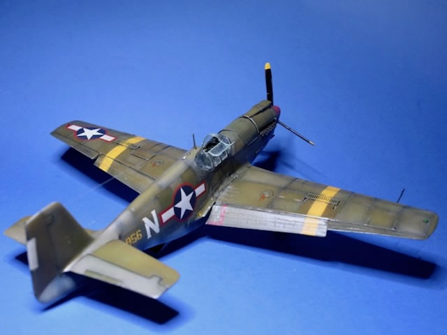 The shape is accurate but it is still worth doing a trial fit. The cockpit will need to be refitted as the fuselage halves come together as they do not fit perfectly. Like many P-51 kits in any scale the wheel wells are boxed in when they should have a recess in the back. Machine guns were redone with brass and copper scratch-building and the door over the machine gun bay opens and closes.