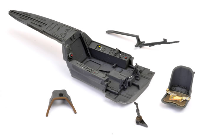 Here are the equivalent kit parts. By the time they are painted up and have the photo-etched parts added they will look very good, but I think the BRASSIN parts are noticeably finer and better detailed, especially the sidewalls, the rear deck and the pilot’s seat.