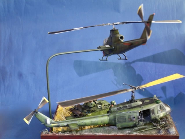 I had planned to do this for a while. It features the Revell Huey and Cobra in an evacuation scene. In the foreground will be an M113 ACAV knocked out by an RPG. It's a diorama so not too much superdetailing was planned. I had to be flexible with the incident. I tend to work backwards in these projects depending on the markings of the vehicles. My reading so far was that UH1D gunships were used with troop carriers (slicks). The gunships were later called Cobras and these were later replaced by the AH1G cobras beginning around 1968. Problem is a number of the famous units cut their teeth on UH1D gunships so they have the history and the nice markings. I was unable to find a unit that featured both UH1H (or D) and AH1G with sharkmouths. So anything accurate for the time would have to do.