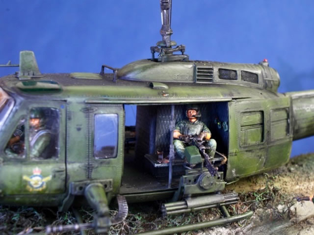The UH1H is configured as an Australian Bushranger. The Bushrangers had a number of unique features. Principal amongst this were the armament. I made the crew seats from copper and brass. The pilot seats were detailed using brass and copper and the seat belts were from Eduard. Eduard’s choice of colors is baffling to me as they always seem too bright so I toned it down a bit using washes. The final operation configuration of the Bushranger for the remainder of its service in Vietnam was: 2 x M-60 General Purpose Machine Guns – this came from the Dragon kit, lightly modified; 2 x M158 7 round reusable rockets tubes – scratchbuilt using styrene tube and coppersheet and the mount had to be modified to accommodate this; 2 x XM-21 forward mounted miniguns – from the Revell kit but mounted forward. Bushrangers like the A2-110 returned to Australia on 8 December 1970 so the dioram is a depiction accurate to 1960 to 1970 (simple). The rotors in the Bushranger were yellow and black as opposed to the yellow tip seen traditionally. I added clear sheet on the trailing edge and painted it to (sort of) simulate movement. After many attempts at both this and the AH1G I sort of just settled (still not happy).