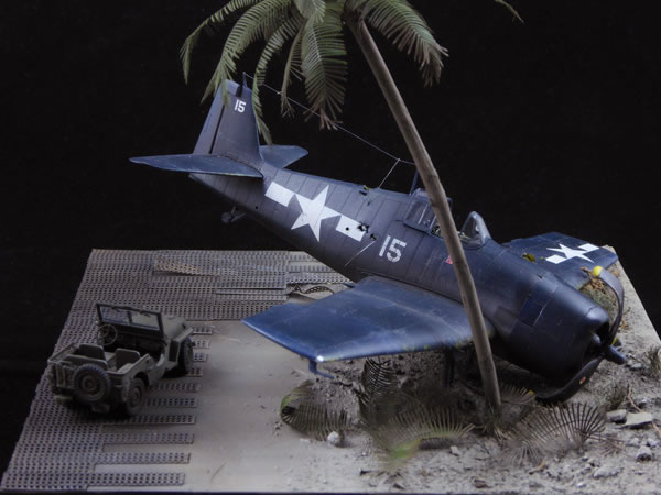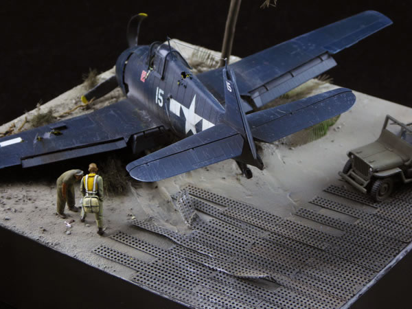 Hellcat after a bumpy landing on one of the many Pacific island airstrips. First aid given to the pilot who hurt his leg in the process.