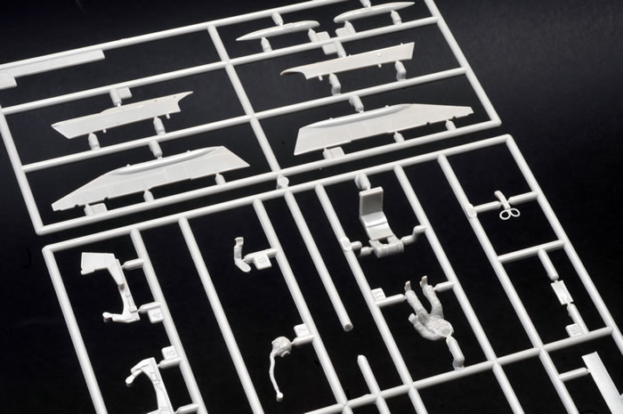 Hasegawa's plastic sprues are light grey. There are only 106 plastic parts, and of these 14 are marked not for use. 14 clear parts are also included, with three marked not for use.