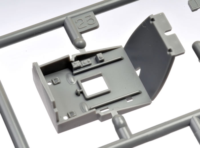 Cockpit detail is good. Some sidewall detail is moulded directly onto the fuselage sidewalls. There are a few alarming ejector pin circles here, but some are actually locating positions and they are all covered up when the cockpit parts are glued in place.
