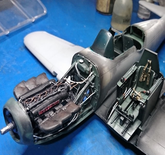 The propellers could not be scavenged off another kit as it is quite unique – long like a mosquitoe blade but thin and narrow like a Spitfire. I did this a few times in resin and plastic but it was prone to warping until finally a brass core was used in the casting. The engine braces were soldered steel masters used to make resin castings. Various odd bits and cabling out of brass and solder completed the engine compartment.