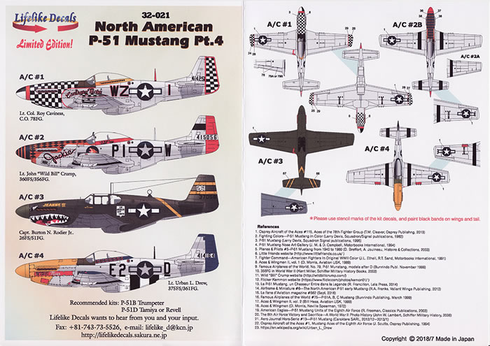 I have been supplied with 2 sets of the North American P-51 Mustang Pt.4 sets in 2 scales, 1/32 and 1/72. The contents of the decals schemes are identical, just bigger and smaller versions.
