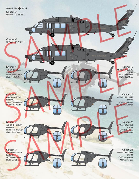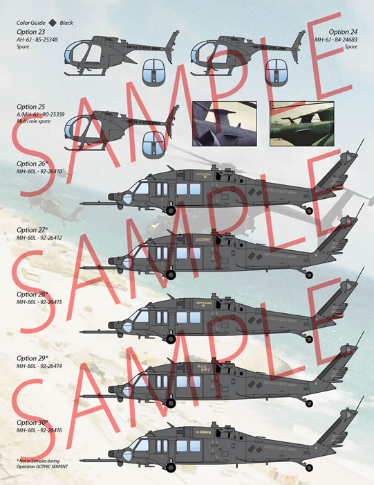 THIRTY aircraft are included on these sheets. This sheet covers EVERY Task Force 160th aircraft that was deployed to Somalia as part of OPERATION GOTHIC SERPENT, including the replacement aircraft and maintenance spares. Also included, is a full set of stencils for one MH-60L and one AH/MH-6, including rocket pod stencils for the AH-6Js.