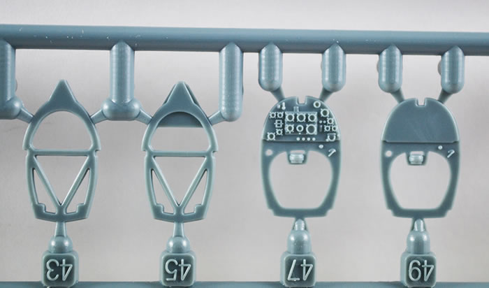 Finally we get to the sprue having the fuselage halves, wings, rudders (a choice between the pointed one and the rounder rudder. The fuselage and wings exhibit refined detail, both recessed and raised as is necessary. Rivets are fine and restrained and easily could disappear under a heavier coat of paint.