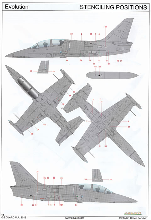 The instruction book is the usual Eduard glossy A4 booklet of 12 pages. 2 pages are of the schemes offered which are both display schemes with an Evolution type theme, one page of the stencil positioning with the remainder of the booklet with clearly laid out construction diagrams. Paint call outs are for Gunze paints, both Aqueous and Mr Color, and for Mission Model paints.